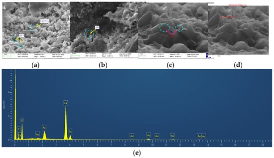 Micromorphology of calcium carbonate. (a) 0 d; (b) 7d (c) 28d; (d) CaCO3 (e) eds.
