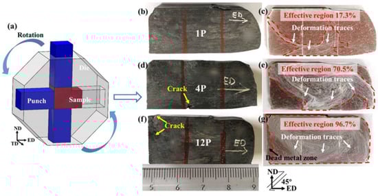 (a) Schematic of the RD-ECAP die (b,d,f), the macrographs of multi-pass RD-ECAP-processed sample, and (c,e,g) deformation traces revealed by metallographic corrosion, where the severe deformed zones were surrounded by red dotted lines.