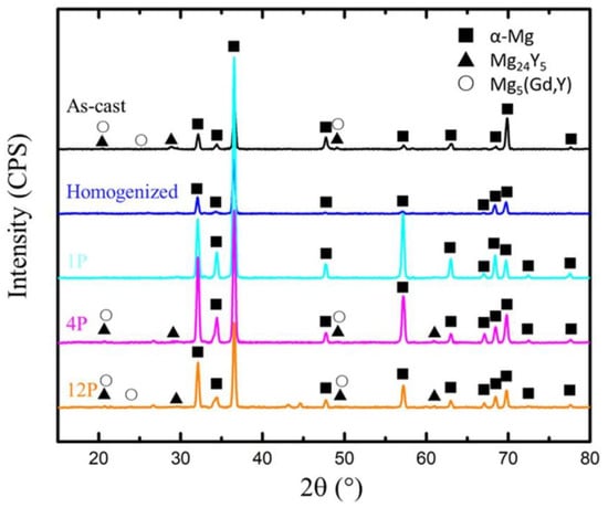 Figure 2 presents the OM of the microstructures of the homogenized and RD-ECAP-processed samples. As shown in Figure 2a,b, the sample was homogenously treated at 530 °C for 10 h, and a microstructure with large equiaxed grains was obtained, the average grain size measured about 140 μm. Some insoluble particles can be observed, most of which are distributed along the grain boundaries (GB); only a few exist on the matrix. Similar results were reported in Ref [43,44,45]; with the addition of RE elements as Gd or Y, the segregation of particles will exhibit a tendency towards grain boundaries due to the large atomic size misfit with Mg and high bulk solubility. After a single pass of RD-ECAP, the grains were significantly elongated and oriented towards the ED due to the shear deformation at the junction of the channel (Figure 2c,d). Fine recrystallized grains appear at grain interiors or at some GB, which are generally clustered as belts. The particle distribution of the 1P sample is similar to the homogenized one, however, more particles can be observed near the GB. With the deformation increased to 4 passes, the microstructures were completely different. Figure 2e,f show that the microstructure of 4P sample was a combination of areas of elongated grains and uneven deformation traces. This indicates that the observed deformation traces in Figure 1 are mainly related to those refined particles induced by simple shear deformation during the RD-ECAP process. The recrystallized fine grains are difficult to observe by OM. For the 12P sample, the distribution of fine particles is dispersed and the deformation traces/flow lines become uniform (Figure 2g,h). The results show that a much finer microstructure with small grains and particles is aligned with the deformation flow lines, which presents evidence that the large, imposed shear strain accelerates fragmentation of the sample. Figure 3 shows the XRD-measured phase composition of samples in different conditions, and the Mg-RE particles were rarely detected in the homogenized sample which were more frequently found in the as-cast and RD-ECAP-processed samples.