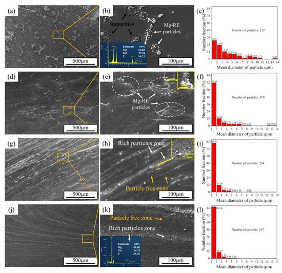 SEM images are presented in Figure 4. SEM was performed to investigate the evolution of the spatial distribution and size of the particles during the RD-ECAP process. The mean diameter of coarse particles (diameter > 1 μm) was obtained by “image pro plus” software, and the size distributions are illustrated in Figure 4c,f,I,l. In the homogenized sample, shown in Figure 4a,b, the particles can be distinguished into two main types: the well-known cuboid-shaped Mg-RE particles [46] (in white circles) and impurities (in black circles), which are close to a spherical shape. The mean diameter of particles is larger as compared to the deformed samples; some particles even exceed 13 μm. As can be seen in Figure 4b,k, the composition of two particles is analyzed by energy-dispersive spectroscopy (EDS).