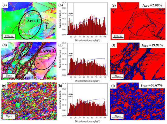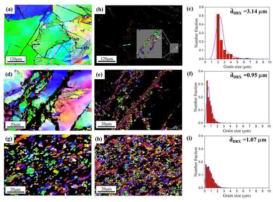 Separated EBSD maps of (a,d,g) deformed grains and (b,e,h) DRX grains. The grain size distribution of DRX grains is presented in (c,f,i) by the number fraction.