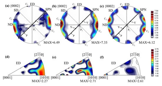 The IPF in Figure 7d presents a strong texture component of <100 >//ED for 1P sample. The texture components of 1P sample are mainly provided by the deformed coarse grains as shown in Figure 5 and Figure 6, the surface fraction of DRX grains only occupied 2.08% which has limited influence on the texture. The 4P sample presents a random texture distribution as shown by IPF in Figure 7e. For the 12P sample, as seen in Figure 7f, the texture was weakened and a new texture component with c-axis parallel to the ED formed. These “abnormal texture” components have been reported in Refs. [55,56,57], it has been defined as “C-texture”, which was usually observed in extruded Mg alloy with a high extrusion ratio and/or in the extruded Mg alloy with RE contained.