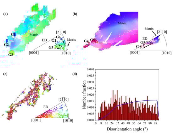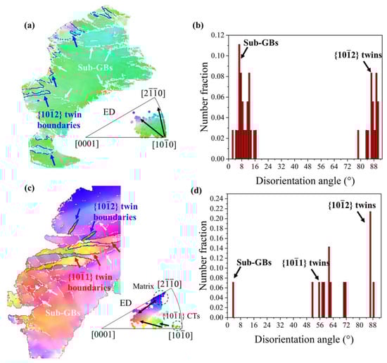 In order to further investigate the texture evolution during the RD-ECAP process, several representative areas were selected from Figure 5 and presented in Figure 8 and Figure 9. As the texture transformation is strongly related to the DRX during the hot deformation, the typical twin induced dynamic recrystallization (TDRX), continuous dynamic recrystallization (CDRX) and discontinuous dynamic recrystallization (DDRX) mechanism are systemically analyzed based on the EBSD results of 1P and 4P samples. Figure 8a shows a deformed zone of 1P sample, where massive sub-GB and {} extension twins (ET) can be observed. It is obvious that the area surrounded by sub-GB and/or twin boundaries have different color gradients with the matrix, which is the orientation gradient induced by the related deformation, where sub-GB in the interior of the matrix represents the process of CDRX [58]. Simultaneously, TDRX occurs with the high dislocation activity within or at the {102} twin boundaries; the accumulated dislocations near the boundaries provide the nucleation sites for new DRX grains [59]. The direct projection IPF plot shows the same results in Figure 7d, which confirms the formation of {102} ETs and sub-GB induced by reorientation of the local matrix from <100> to <20>. At the early state of 1P, DDRX is considered as the main DRX mechanism, where the serrated GB of matrix provides the nucleation site for DDRX [58,59] and the dense Mg-RE particles along the GB promote the DDRX by the particle stimulate mechanism (PSN) [60,61]. As can be observed in Figure 6b, the fine grains induced by DDRX have no preferred orientations [9]. The related disorientation angle distribution of area 1 is shown in Figure 8b. With the imposed strain increased to 4.6 of 4P, more disorientation appears in the deformed matrix seen in Figure 5d. Figure 8c,d reveal that both {102} ET and {101} compression twins (CT) can be activated in the 4P sample. As shown by Jiang et al. [58], which carefully studied the shear effective zone of extruded AZ31 alloy, {101} CT and <100> fiber texture appeared after the trigger of {102} ET due to its higher critical resolve shear stress (CRSS) and TDRX can be easily induced by {101} ET and {101}–{102} double twins. In our work, the formation of a large number of sub-GB in the {101} CT confirms the reported results. Under this condition, the matrix shows a reorientation tendency from <20> fiber to <0001> basal fiber, and the orientation of {101} CT shows a reorientation tendency of <100> fiber towards <0001> basal fiber. Finally, more texture components formed with weak intensity and the strong initial <100> basal texture weakened.