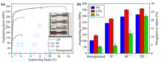 Figure 10 displays the tensile stress–strain curves of the GW103 alloy after different processing conditions. The results reveal that RD-ECAP is an effective process to simultaneously achieve the enhancement of both the strength and ductility of GW103 alloy. After the 1P process, the yield stress (YS) was significantly increasing from 104 MPa to 243 MPa with the ultimate tensile strength (UTS) increased from144 MPa to 278 MPa. However, the elongation to failure (EL) has barely increased, which is due to the limited DRX and clustered coarse Mg-RE particles along GBs as shown in Figure 2 and Figure 4. When the alloy was treated by 4P, the particle size was refined (Figure 4); and a bimodal microstructure formed with more DRX fine grains (Figure 5), as a consequence both the strength and ductility were improved, where the YS, UTS and EL are 295 MPa, 351 MPa and 12%, respectively. For 12P sample, the YS and UTS showed no obvious improvement, which were 312 MPa and 360 MPa. However, the highest EL of 22% was obtained.
