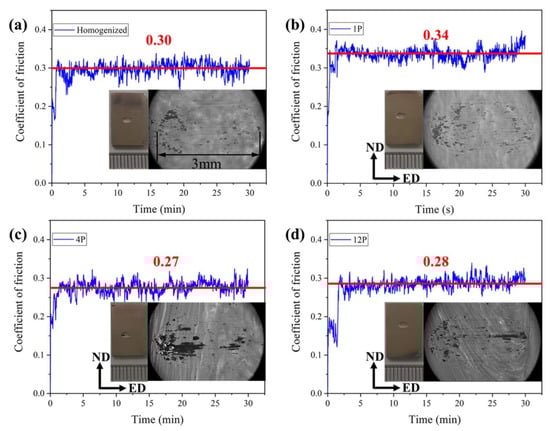 The fluctuations of the coefficient of friction (COF) versus testing time are shown in Figure 11 for the samples with different processing states. The related macrographs and SEM morphologies in BSE of wear areas are also presented in the Figures. The friction testing was carried out at a 10 N loading, and the sliding direction is along the ED. For 1P, 4P and 12P samples, it can be observed that the testing zone is in the effective RD-ECAP deformed zone based on the precipitate distribution in and Figure 4 and Figure 11b–d. The results reveal that the average COF varies from processing conditions. When the sample was treated by the first pass, the highest COF of 0.34 was obtained. However, with the increasing imposed strain, the COF decreased to 0.27 and 0.28 for 4P and 12P samples, respectively. The COF of multi-pass RD-ECAP-processed sample is lower than the homogenized sample (0.3).