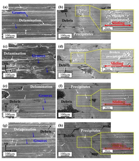 Figure 12 presents the worn surfaces of the different processed alloys. Typical characteristics of delamination, grooves and debris [33,35] can be observed in all the samples. However, the observed rough surface of 1P sample (Figure 12c) seems to have dramatically deformed. A similar phenomenon was reported in [32] for ECAP-processed Mg-Sn alloys; due to the high dislocation density and stress field in ECAP process, the oxidation rate will quickly occur during the wear test. The mechanism will change from abrasive wear to oxidative wear in the ECAP-processed samples with high dislocation density and stress field. However, the RD-ECAP process was performed at a high temperature of 450 °C; for 4P and 12P samples, there exist rare residuary dislocation and stress fields. Therefore, the wear mechanisms of 4P and 12P samples are similar with the homogenized sample. As the precipitates are another important influencing factor during the friction testing [65]; SEM images in BSE are shown in Figure 12b,d,f,h. The precipitates distributions of the homogenized sample and 1P sample are observably changed compared to that in Figure 4. The clustered precipitates were broken and scattered during the friction testing for the two samples, as shown Figure 12b,d; the precipitates are no longer distributed along the grain boundaries which are dispersed with a new distribution tendency along the sliding direction. For 4P and 12P samples, the appearance and distribution of precipitates was maintained after being processed. The results demonstrated that the precipitates could hinder the friction during the test. According to the particle size and distribution in Figure 4 and Figure 12 and the curves of COF in Figure 11, it can be concluded that the refinement and dispersion of precipitates during the shear deformation could also benefit the reduction in the COF.
