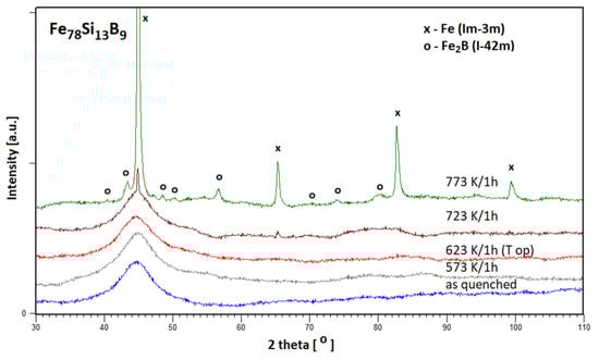 The X-ray diffraction patterns obtained for the investigated alloys as-quenched and annealed at Ta = 573 K/1 h, Ta = Top = 623 K/1 h, Ta = 723 K/1 h (where the first step of crystallization is observed) and at Ta = 773 K/1 h are presented on Figure 2. The phase analysis performed with using the ICDD PDF4+ 2016 data base shows presence of Fe (Im-3m) and Fe2B (I-42m) phases.