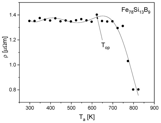 Careful examinations of the microstructure of the optimized samples (annealed at Top) carried out by applying X-ray diffraction and high-resolution electron microscopy do not show any traces of nanostructure, which means that optimization takes place in the relaxed amorphous phase. This fact is also confirmed by the isochronal electrical resistivity curves after 1-h annealing (measured at room temperature). A drastic decrease of resistivity connected with the crystallization process occurs above the Top temperature (Figure 3).