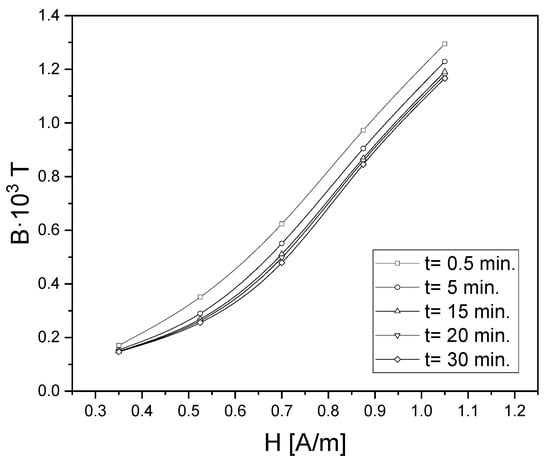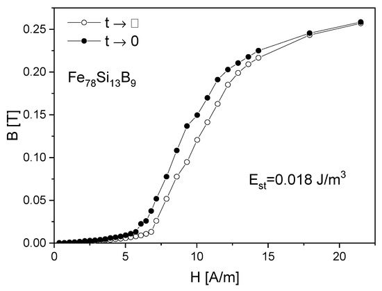 Figure 7 presents the primary magnetization curves B(H,t) obtained by static measurements, extrapolating to times and . After integration in the H = f(B) coordinate system, the value J/m3 was obtained.