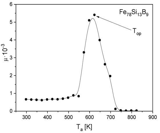 The optimization temperature Top (temperature of heat treatment that leads to obtaining the best soft magnetic properties) was determined from isochronal relative magnetic permeability curves versus 1 h annealing temperature (measurements were made at room temperature) as the temperature at which the permeability reaches its maximum.