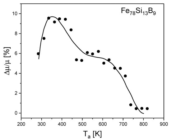 The magnetic aftereffects curves versus the 1 h annealing temperature are presented in Figure 6. The quantity Δμ/μ is proportional to the concentration of relaxators.
