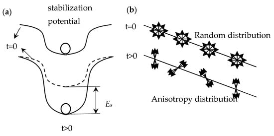 In a stabilized sample, the interstitial atom distribution is the equilibrium distribution with respect to the existing domain structure. After demagnetization, a new domain structure appears in which the distribution of interstitial atoms (impurities) is no longer an equilibrium distribution. As a result, the permeability after demagnetization is much higher than in the case of a stabilized sample (after time t → ∞ from demagnetization). The directional ordering of the interstitial atoms leads to a new distribution of atoms, corresponding to the new domain structure. The bottom of the potential, in which the domain wall is located, is “deepened” (Figure 9a), which in turn reduces the magnetic susceptibility, i.e., its disaccomodation [].