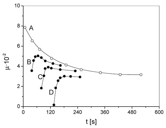 In measurements in which the sample is magnetized with an alternating magnetic field, there is the so-called Webb–Ford effect for higher magnetic field strengths. In the case of very weak magnetic fields (for αFe-C of 1 mOe), the curve captured in the alternating field follows the same course as the curve obtained statically. For fields of about 10–100 mOe, when the sample is magnetized continuously, the permeability graph behaves slightly differently—its beginning will be consistent with the static curve, and then runs much higher than it (Figure 10, curve A). If a relatively short time t1 elapses after demagnetization, then the magnetic permeability, and thus the magnetic susceptibility, instead of decreasing monotonically with time, will first start to increase and only after passing a certain maximum will decrease monotonically (Figure 10, curves B, C).