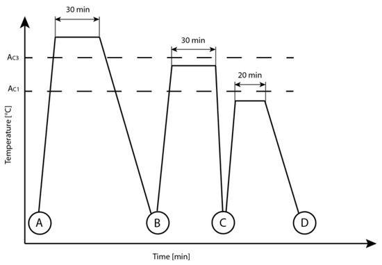 Schematic representation of the heat treatment stages: Full annealing (A,B), intercritical annealing and quenching (B,C), and tempering (C,D).