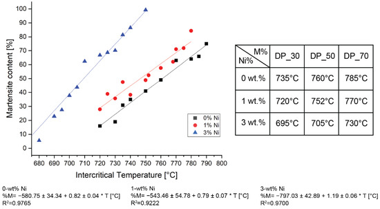 Image analysis based on systematic manual point counting, following the ASTM E562-19 standard [27], was performed to correspond the phase ratio to the intercritical annealing holding temperature. The martensitic phase increased linearly with increasing holding temperature for a given Ni content, as shown in Figure 3. This behavior was expected based on the lever rule; as the austenite content increases with the intercritical temperature, more martensite will be introduced after the quenching transformation [36]. An increasing Ni content lowers Ac1 and Ac3 according to Equations (1) and (2) [25,35]. This effect was visible when fixing the intercritical annealing temperature in Figure 3 and comparing the martensite content as a function of Ni. For instance, with a holding temperature of 720 °C, the obtained martensite content was 15%, 28%, and 65% for 0, 1, and 3-wt% Ni, respectively.