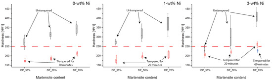 Figure 4 also compares the hardness values distribution obtained after the tempering stage (red boxes). Most samples met the hardness limit, plotted in red dash line, after tempering for 20 min. Only for the sample with the highest Ni and martensite contents (i.e., 3-wt% Ni DP_70%) the tempering time was extended to 60 min to meet the threshold (blue box).