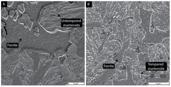 The effect of tempering on the microstructure was analyzed by SEM. Figure 5A shows the microstructure before tempering, composed of ferrite and martensitic islands. In some cases, carbides were visible within the ferritic grains, which could be linked to undissolved carbides from the ferritic–austenitic range [32]. The untempered martensite contained packets of individual units called laths with determined orientations [38]. Microstructural evolution due to tempering resulted in carbide precipitation, as shown in Figure 6B. A greater carbide size (150–400 nm) had preferential precipitation on prior lath boundaries and austenitic grain boundaries. A smaller carbide size distribution (30–150 nm) was also found between lath boundaries. Based on the choice of tempering temperature (i.e., 550 °C), the observed carbides are expected to be cementite [39].