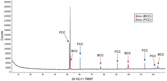 Figure 6 illustrates the diffraction pattern of the 3-wt% Ni DP_70% sample, in which the characteristic patterns for body-centered cubic (BCC) and FCC are displayed in red and blue, respectively, and labelled. The peaks matching red lines corresponding to BCC crystal structures represent ferritic or martensitic phases. In addition, if present, peaks associated with blue lines would indicate austenite. The implemented method revealed diffracted XRD peaks correlated to crystallographic phases with a concentration higher than 1-wt%. XRD peaks associated with FCC were not found, indicating the absence or a concentration lower than 1-wt% of retained austenite.