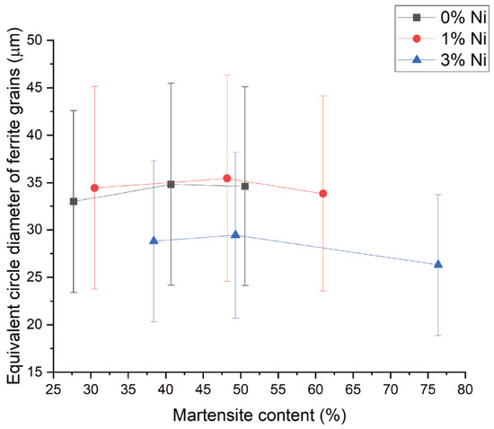 The ferrite grain size distribution in μm plotted in Figure 7 was obtained by correlation following the ASTM E112-13 standard [34]. An apparent reduction of the equivalent circle diameter was observed when comparing the 3-wt% Ni against the lower Ni contents.