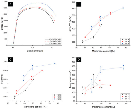 Representative engineering tensile stress–strain curves for martensite content around 50% with 0, 1, and 3-wt% Ni (A). Variation of 0.2% YS (B), TS (C), and toughness (D), as a function of the martensite and nickel content.