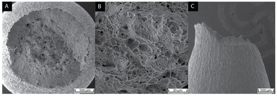 After mechanical testing, the tensile samples’ gauge sections were analyzed using SEM to evaluate the fracture surface to determine the fracture mode and characterize potential secondary cracking. In addition, a fracture cross-section was analyzed by SEM-EBSD to evaluate the crack growth path.