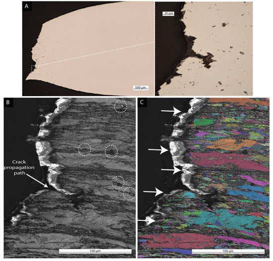 The crack propagation morphology was studied by cross-section analysis of the fracture zone using the sample shown in Figure 9 (i.e., 0-wt% Ni 40.7% martensite content). The fractured sample was mounted in epoxy resin and reduced in thickness to approximately half the size. Next, the polished surface was characterized by light optical microscopy (LOM) to identify the region of interest, as shown in Figure 10A. Finally, the sample was ion milled and carbon-coated, following the EBSD procedure detailed in the Section 2. Two EBSD maps were selected for this analysis. Figure 10B represents a band contrast (BC) map, in which the dark regions indicate the martensitic phase and the grey zones the presence of ferrite. The arrow shows the crack propagation through the martensitic phase, and the dash circles depict microvoids limited to the martensite regions. Additionally, the map shown in Figure 10C represents each grain orientation with random colors to differentiate the grains in which the martensitic bands are indicated by arrows. An elongated grain distribution was observed due to the plastic deformation due to the tensile load in the necking zone.