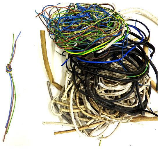 Waste plastics, also known as PW, were supplied by the recycling company Eco Harpoon Sp. z. o.o with registered offices in Cząstków Mazowiecki (Poland). The share of waste plastics in the material delivered was determined on the basis of the organoleptic identification undertaken. The waste was in the form of cut and torn outer and inner wire covering. Figure 1 shows an example of the electric cable bundles provided by the company.
