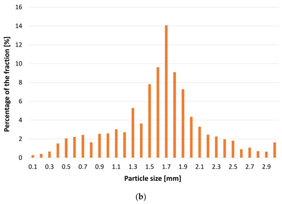 Subsequently, electric cables were subjected to pre-treatment processes, including shredding and separation processes, resulting in a fraction of the waste plastics (PW), namely, the so-called “speck”, being devoid of some metals, i.e., aluminium. Shredding stage was performed with the Wire Shredder Stokermill K750 (STOKKERMILL Recycling, Udine, Italy). Subsequently, speck was characterised in terms of its size and quantity using sieves with different mesh sizes ranging from 0.1 mm to 3 mm. Percentage distribution of individual fractions (together with the comminuted plastics) is shown in Figure 2b. Initial weight of speck was 463.101 g.