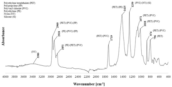 In order to accurately conduct the analysis of the tested waste cables, the FTIR analysis was performed. The absorption spectra ranged from 400 to 4000 cm−1 using an ATR detector with a resolution of 16 scans per spectrum and an optical resolution of 4 cm−1. In order to maintain the reliability and repeatability of the results, the ATR crystal was cleaned with alcohol-soaked tissue after each measurement. Before each measurement, the background spectrum was measured and collected. The tests were carried out in ambient conditions (room temperature 23 °C, air humidity 40%). The FTIR−ATR analysis was performed for six samples, and then the result was averaged. The measurement results are shown in Figure 6.