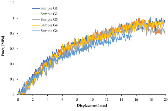 On the basis of compression tests, yield point Re was calculated. The results of the measurements and calculations are presented in Table 2. The waveforms of compressive stresses are presented in Figure 7.