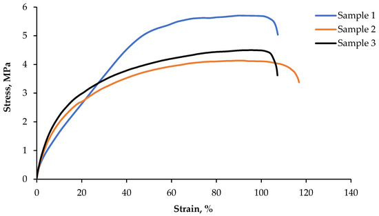 Results of the uniaxial stretching test are shown in Figure 9. Three stretching tests were performed on standard, paddle-shaped samples, according to the standard ISO 37:2005 [52]. Based on literature data [53], pure polyvinyl chloride reaches a value in the range of 0.785 to even 156 MPa, while Shore hardness ranges from 35 to 110MPa. It depends on the addition of plasticizers to the material. For example, Tygon polymer B-44-4X contains a small amount of phthalate plasticizers (orthophthalate), which reduce the intermolecular interaction and increase the mobility of polymer chains. Thus, they reduce hardness and increase its flexibility. Comparing the results of the static tensile test with other polymers, such as Silopren E VPI 4036 G, Tygon polymer R-40, Siloprene E3078, etc., the properties of the obtained material are similar to the commercial Tygon Polymer R-1000 [53]. Its tensile strength is about 8 MPa, and the hardness is 40 Shore. The presented graphs show that the tensile strains are elastic to the failure point with deformations exceeding 100% (Table 5). Tensile strength is typical for this group of materials.