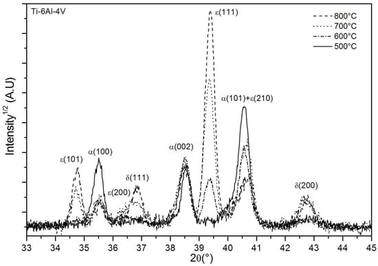 X-ray diffraction with an incidence angle of 5° was performed on Ti-6Al-4V specimens treated for 240 min at 500, 600, 700 and 800 °C. Results are shown in Figure 1. The diffraction peaks are identified as the hexagonal α-Ti (JCPDS 00-044-1294) and as two phases of titanium nitride, namely, ϵ-Ti2N (JCPDS 04-004-3072) and δ-TiN (JCPDS 00-038-1420). A (110) β-Ti phase peak, observed at 39.2° on the as-received sample (not shown here), is not detected anymore after the nitriding process. For the treatment performed at 500 °C, ϵ-Ti2N is not observed, only the most intense (200) peak of δ-TiN is detected with a very low intensity because of the low diffracting volume. In fact, this layer cannot be detected on SEM cross-sectional images, as discussed in more details below. With increasing treatment temperature, the nitride phases peaks grow, especially ϵ(111), while the intensities of the (100) and (101) α-Ti peaks decrease. The increase of peak intensity of TiN and Ti2N indicates larger diffracting volumes, presumably because of a thicker layer being formed, although it is difficult to be quantitative. Noticeably, the (002) α-Ti peak intensity remains constant. This modification of the relative intensity of α-Ti peaks could be the consequence of some degree of texturation of the nitrogen-induced recrystallized α-Ti layer formed underneath the nitride layers. In fact, this recrystallized layer becomes thicker with increasing treatment temperature. A slight line shift towards the small angles of the (002) α-Ti peak is observed. It can be linked to two phenomena that coexist: a dilatation of the α-Ti cell due to nitrogen incorporation and the presence of compressive residual stresses induced by the presence of interstitial nitrogen. As expected from the preferential expansion of the α-Ti cell along the c axis upon nitrogen uptake [32], almost no low angle shift is detected for the (100) peak.