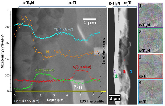 A cross-sectional SEM micrograph, EDS profile and EBSD phase identification performed on the sample nitrided at 800 °C are shown in Figure 2. PBII treatment performed at an elevated temperature induces important microstructural changes. According to Figure 2, the surface area is composed of two layers with rough interfaces of thickness slightly larger than 1 μm for the external one and about 1.5 μm for the internal one with a grain size of around 500 nm. These thicknesses are in good agreement with the qualitative GDOES profiles obtained on this sample (see Figure 3 right hand side). According to the EDS profile and EBSD analysis (shots 1 and 2, Figure 2), the top layer is mainly composed of ϵ-Ti2N. Surface nitriding leads to counterdiffusion of aluminium and its accumulation right below the nitride layer, as confirmed via the EDS profile (Figure 2). Recrystallization is observed in the aluminium-rich layer leading to a small grain microstructure. However, Al enrichment does not seem to lead to Ti3Al phase formation (EBSD shots 3 and 4, Figure 2), contrary to what is observed at 1100 °C [33] or when Ti-6Al-4V alloy was glow discharge nitrided at 680 °C/4 h and 750 °C/3 h [34]. Vanadium-rich β-Ti grains are observed a few microns below the two layers marking the end of the diffusion zone of alphagen nitrogen. In the most superficial region affected by the treatment N indeed inserts into β-Ti, and as it is a strong α stabilizer, changes it to α-Ti. As a consequence, almost no β-Ti grains remain. Hence, the nitrided layer formed in this study consists of δ-TiN and ϵ-Ti2N imbricated small crystals supported by an α-Ti(N) solid solution.