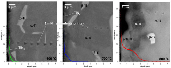 The evolutions of hardness are plotted as a function of the distance for three of the used temperatures in Figure 4. A strong evolution in the hardness values is observed at the vicinity of the treated surface, revealing the mechanical changes induced by the nitriding process regardless of the temperature used. The profiles can be divided into three domains (I, II, III in Figure 4). The first one is about 3 μm in depth and is characterized by a strong decrease in the mechanical properties. In the second domain, which extends from 3 to 10–15 μm in depth depending on the treatment temperature, the decrease is less abrupt. Only at 800 °C, do we observe a small plateau of about 5 μm depth. The plateau results from the formation of a Ti2N as already revealed with GDOES because of the N saturation of the alloy, as modeled in ref [1]. The third domain corresponds to the bulk.