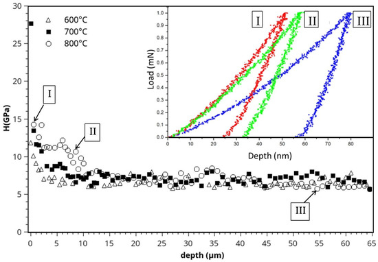 Hardness profiles for 3 treatments at 600 °C, 700 °C and 800 °C. Inset loading-unloading curves obtained for sample treated at 800 °C in three zones (I, II, III) defined on the profile.