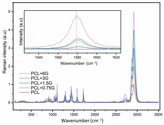 Raman spectroscopy confirmed that G is exposed on the upper surface of the G-loaded scaffolds, as opposed to being encapsulated in PCL (a possibility due to the melting process prior to extrusion). This is confirmed by a Raman peak at 1577 cm−1, which is indicative of the G band associated with graphene, in the spectra for G-loaded PCL scaffolds (PCL+0.75G, PCL+1.5G, PCL+3G, and PCL+6G), as shown in Figure 2, with the same figure demonstrating the absence of said peak in the spectrum for the pure PCL scaffold, as expected. The inserted zoomed-in image in Figure 2 demonstrates the varying intensity of the Raman peak at 1577 cm−1 across the G gradient, that, in general, increases across the gradient (0.75–6% G). There was a marked increase in intensity from the PCL+3G to PCL+6G scaffold. All spectra demonstrate highly similar spectral profiles with eight common Raman peaks for PCL detected at ~909, 1108, 1307, 1438, 1725, 2748, 2871, and 2921 cm−1 (Figure 2).