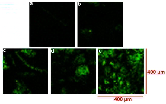 Raman spectroscopy was also employed to give qualitative information on the distribution of G on the upper surface of the scaffolds by mapping the intensity of the Raman peak at 1577 cm−1 across a specific surface area (400 µm2) of each scaffold type. The intensity of G detected is represented by the presence of ‘green’ colouration in the Raman maps presented in Figure 3. As expected, no green colouration was detected for the pure PCL scaffold (Figure 3a), with increasing intensity of ‘green’ colouration seen for the G-loaded PCL scaffolds (Figure 3b–e), demonstrating the increasing concentration and distribution of G within the PCL-based filaments of the scaffolds. The maps shown in Figure 3b–e appear to indicate an even distribution of ‘green’ colouration due to G.