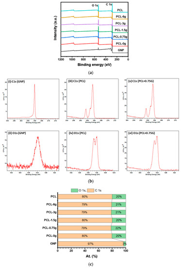 XPS survey scans (0–1200 eV) from one random location on the upper surface (<10 nm) for the as-received G nanoplatelets (GNP), as-received PCL powder (PCL+0G), and 3D-fabricated scaffolds are shown in ascending order in Figure 4a. Only peaks assigned to a C1s at ~285–289 eV and O1s at ~533.7 eV photoemission are present in each case. High-resolution scans of the C1s and O1s regions for the as-received G nanoplatelets (GNP), the as-received PCL powder (PCL+0G), and the 3D-fabricated PCL scaffold with 0.75% (w/w) GNP (PCL+0.75G) are shown in Figure 4b. The percentage atomic concentration (At%) for the C1s and O1s contributions detected in each sample type is presented in Figure 4c. The At% C1s and O1s contributions for the as-received G were 97% and 3%, respectively, while those for as-received PCL and 3D fabricated scaffolds were all in the ranges 79–80% C1s and 21–20% O1s.