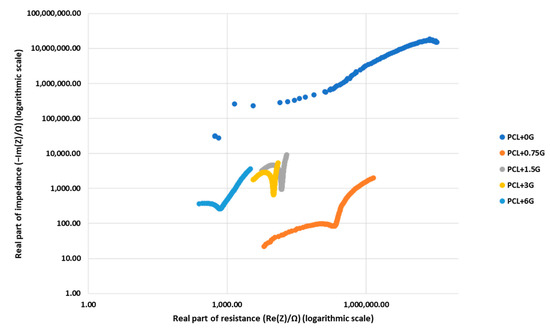 Nyquist plots for all 3D-fabricated scaffolds, PCL, PCL+0.75G, PCL+1.5G, PCL+3G, and PCL+6G (see key), generated from EIS measurements with a 3-electrode cell configuration, with each scaffold type acting as a working electrode. Cardiac cell specific medium acted as the electrolyte solution, and prior to data collection, the working electrodes were submerged in electrolyte solution for 48 hours at 2−8 °C. Data were performed at the open circuit potential, with the application of an alternating current sinusoidal perturbation voltage of 10 mV (root mean square) at a frequency variation of 1 Hz to 1 MHz. The x-axis is Real part of resistance in Ω (logarithmic scale), and the y-axis is Real part of impedance in Ω (logarithmic scale).