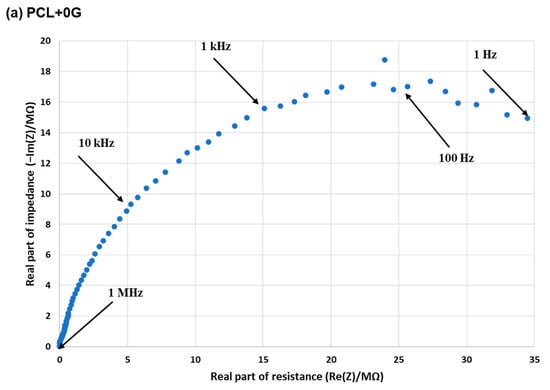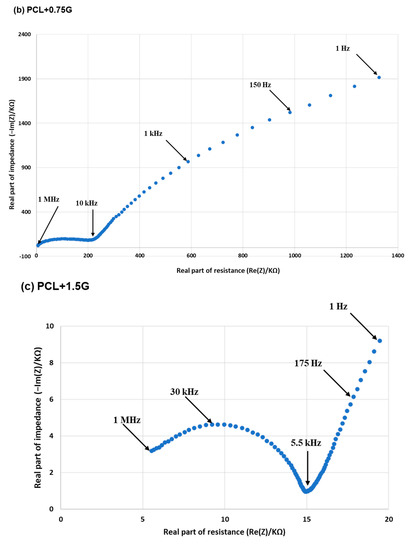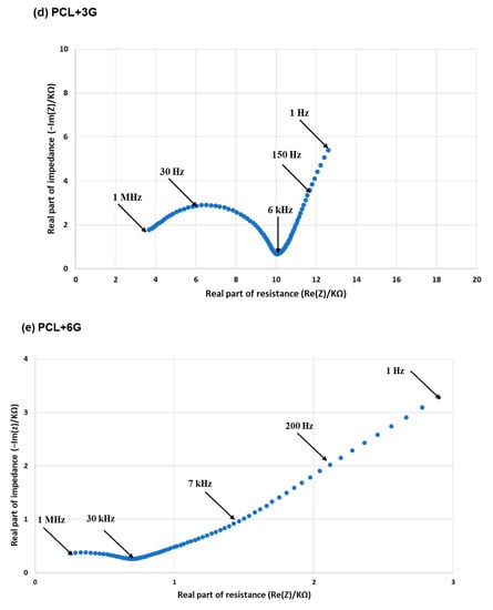Nyquist plots representing the real and the imaginary parts of impedance measurements for each scaffold type are provided in Figure 5 and Figure 6 as a measure of their electroconductivity. Figure 5 shows all EIS data for the five scaffolds on one Nyquist plot to aid in the comparison of impedance changes, while Figure 6 shows five Nyquist plots, one per scaffold, to aid in EIS data clarity per scaffold. The graphical data plots can be divided into two parts, with the first being the high-frequency region, which exhibits a semi-circular arc where the bending implies the operation of a charge transfer mechanism. The diameter of the semi-circle in the Nyquist plot allows for an estimation of the magnitude of the charge transfer resistance of the working electrode (scaffold). In the low-frequency range, a linear region can be observed, which implies the occurrence of a diffusion mechanism [16]. Figure 6a demonstrates a semi-circular plot with a large real and imaginary impedance (in MΩ) for the experimental control, the pure PCL scaffold, with the broad diameter signifying a hindering of any swift charge transfer and indicating the expected poor electroconductivity. Figure 6b–e demonstrates that the impedance of PCL is reduced significantly by the presence of G and decreases with increasing G concentration, indicating an improvement in electroconductivity from PCL+0.75G to PCL+6G. For PCL+0.75G, the diameter of the semi-circle (~207 kΩ) is reduced by almost 2 orders of magnitude compared with that for the pure PCL scaffold (Figure 6a,b, respectively). This significant reduction of both the real and imaginary parts of the impedance plot continued on increasing G concentration wherein the diameter of the semi-circles decreased from ~9, 6, and 0.5 kΩ for PCL+1.5G, PCL+3G, and PCL+6G, respectively, thereby indicating an increase in scaffold electroconductivity on increasing G concentration.
