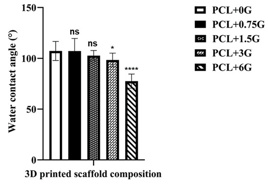 Mean water contact angle (°) values for 3D-fabricated scaffolds, PCL, PCL+0.75G, PCL+1.5G, PCL+3G, and PCL+6G (see key). A 5 µL water droplet was used on each scaffold’s upper surface, and the contact angle derived from curve-fitting using the Young/Laplace equation. Each contact angle measurement was taken on a random location on each scaffold’s upper surface and repeated on a new random location up to twelve times. Errors bars represent mean +/− standard deviation. Statistical significance in comparison with pure PCL, as determined by Dunnett’s multiple comparisons test, is represented by either not significant (ns), where p > 0.05, or significant, where p < 0.05. Increasing significance is represented by an increasing number of asterisks (* p < 0.05 and **** p < 0.0001). The x-axis is 3D printed scaffold composition, and the y-axis is Water contact angle (°).
