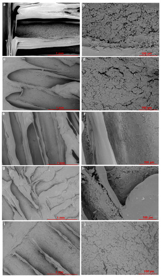 Fabrication of the scaffolds by 3D hot extrusion printing became increasingly more difficult as the G concentration increased; on comparing the pure PCL scaffold (Figure 1a) to the G-loaded scaffolds (Figure 1b–e), the extruded filaments lose uniformity, displaying more fragmented structure and giving a somewhat uneven and ‘ragged’ appearance as the G concentration increases. The most uneven topography/roughness is visible for PCL+3G and PCL+6G scaffolds (Figure 1d,e, respectively).