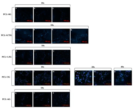 Wide-field fluorescence images for nuclei-stained HL-1 cells from random locations on PCL+0G (experimental control), PCL+0.75G, PCL+1.5G, PCL+3G, and PCL+6G scaffolds cultured under standard conditions for 3 days and acquired at several magnifications (see key). At least 3 random areas per DAPI-stained scaffold were imaged using Colibri 7 LED illumination at an excitation wavelength of 405 nm for 820 milliseconds. Images were captured at 1024 × 1024 pixels of resolution. Scale bar represents a 100 µm distance within images (a–m) and (q–s), a 50 µm distance within the images (n,o), and a 20 µm distance within image (p).