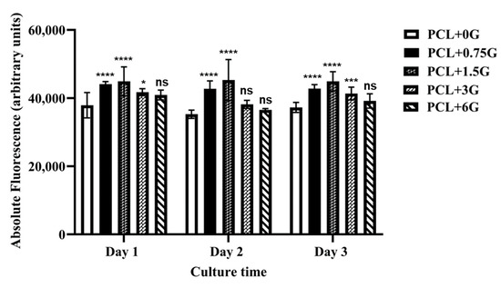 Quantitative data on the ability of the 3D-fabricated scaffolds to support viable cells was obtained by using the Alamar Blue™ HS Cell Viability Reagent on cells seeded on each scaffold type at days 1, 2 and 3 in culture, with the results shown in Figure 11. These data demonstrate that cell viability, as determined by the absolute fluorescence from cells over a 3-day culture period, is in the range ~33,000–54,000 a.u. In general, the results for each scaffold type per timepoint remained relatively static as a function of the culture time. For example, the mean fluorescence intensities for cells exposed to PCL+0.75G scaffolds were 44,111.22 ± 682.53, 42,719.22 ± 2333.68, and 42,791.67 ± 1181.00 at days 1, 2, and 3, respectively. However, at all timepoints, cells cultured on all G-loaded scaffolds (PCL+0.75-PCL+6G) produced higher fluorescence intensity values than those exposed to the pure PCL scaffold. Overall, the PCL+0.75G and PCL+1.5G scaffolds demonstrated the highest degree of cell viability (p < 0.0001) compared with the pure PCL scaffold. The PCL+3G scaffold demonstrated statistically significant increases in viability at days 1 and 3 only (p < 0.05 and p < 0.001, respectively).