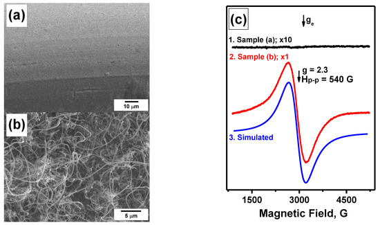 Similar situation was reported for the other bulk nickel alloys (chromel, alumel, etc.). Despite the difference in the shape of the FMR spectra of the initial alloys, they are uninformative ones, and, therefore, their interpretation is complicated. At the same time, after their contact with the aggressive reaction mixture and the formation of carbon nanostructures, the FMR spectra undergo noticeable changes. The wide singlet lines with g = 2.3, which is typical of the dispersed nickel particles, appeared [9,31]. It should be noted that in these works, the shapes of the FMR spectra cannot be fitted by a single Lorentzian-shaped line. This is presumably connected with a wider size distribution of the ferromagnetic particles in the cases of the described samples if compared with the sample obtained via the self-disintegration of nichrome (Figure 2).