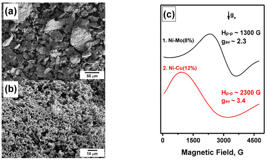 The other two samples studied in the present work, Ni-Cu(12%) and Ni-Mo(8%), are dispersed powders of significantly different morphologies, which is stipulated by the differences in their preparation routes. As seen in Figure 3a, the Ni-Cu(12%) sample is represented by micro-dispersed particles of a wide size distribution (10–150 μm). Since these particles underwent a drastic mechanical action during the MCA procedure, they have a rough surface with a number of cracks and splits. This morphology is typical of the materials prepared by the MCA method [41]. The SSA value for this sample was found to be 0.6 m2/g. The Ni-Mo(8%) sample was prepared by the reductive thermolysis technique [19,43,44]. Such a preparation method results in the formation of particles of a sponge-like morphology (Figure 3b) with a specific surface area of 0.2–0.5 m2/g.