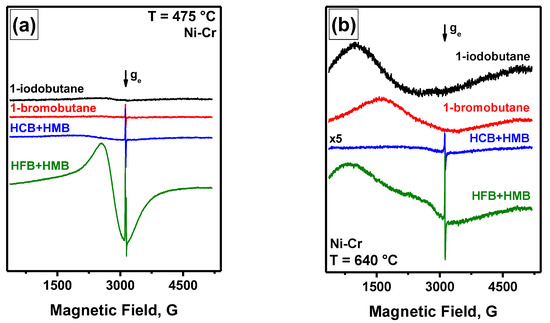 The results of the FMR comparative study on catalytic corrosion of nichrome interacting with various halogens (iodine, bromine, chlorine, and fluorine) under RAPET conditions are presented in Figure 4. The substrates were 1-iodobutane, 1-bromobutane, hexachlorobenzene (HCB), and hexafluorobenzene (HFB). In the last two cases, hexamethylbenzene (HMB) was loaded into the ampule as a hydrogen source for the reaction (2). As seen from the FMR spectra (Figure 4a), in the case of fluorine-containing medium, the formation of quite uniform ferromagnetic particles occurs already at 475 °C. The spectrum is characterized by the narrowest FMR signal (Hp-p = 550 G, g = 2.3), which indicates the formation of relatively small metal particles. An additional heating of the ampule at 640 °C results in changing the shape of the spectrum (Figure 4b). A significant enlargement of ferromagnetic particles can supposedly explain this. The appearance of an intensive narrow EPR signal in a g~ge region typical for paramagnetic sites of coke should also be noted.