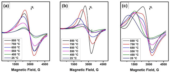 Similar behavior was observed for the Ni-Cu(12%) alloy interacting with polyvinyl chloride. The Curie temperature for this alloy lies near +250 °C, therefore, a wide FMR signal is well seen at room temperature (Figure 3c). Figure 5c shows the evolution of the FMR spectra of this alloy during its interaction with polyvinyl chloride under RAPET conditions. With successive heating of the sample in a temperature range from 450 to 850 °C, the g-factor is shifted toward large fields. The results obtained for this sample also indicate a significant change in the magnetic properties of the initial alloy when interacting with a halogen-containing polymer.