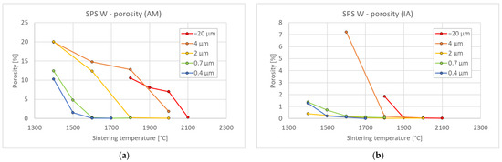 Effect of sintering temperature on porosity for tungsten of different powder sizes; (a) results from Archimedean method (AM), entire sample; (b) image analysis (IA), dense central region.