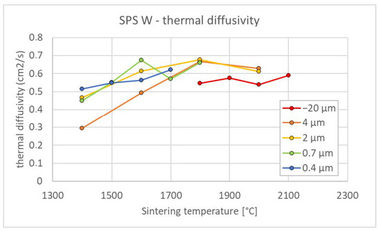 Figure 5 shows the dependence of thermal diffusivity on sintering temperature. A trend of increasing diffusivity with increasing sintering temperature is observed, as could be expected by an improved densification. In addition, the following observations can be made. For a moderate variation in temperature—and therefore porosity—diffusivity varies only a little. This is in contrast to plasma sprayed coatings, for example, where even a relatively small volume of (largely anisotropic) porosity can reduce the diffusivity significantly [22]. Therefore, from the heat transfer point of view—being important for plasma facing components—a small departure from full sintering is not critical. However, even a small amount of porosity can considerably affect the interaction with plasma, as shown in [23]. A second observation from Figure 5 is that, at the same sintering temperature, compacts from finer powders generally exhibit slightly higher diffusivity (due to lower porosity). The results for well-sintered compacts agree with the literature values for conventional bulk tungsten (0.612 cm2/s at 100 °C [24]).